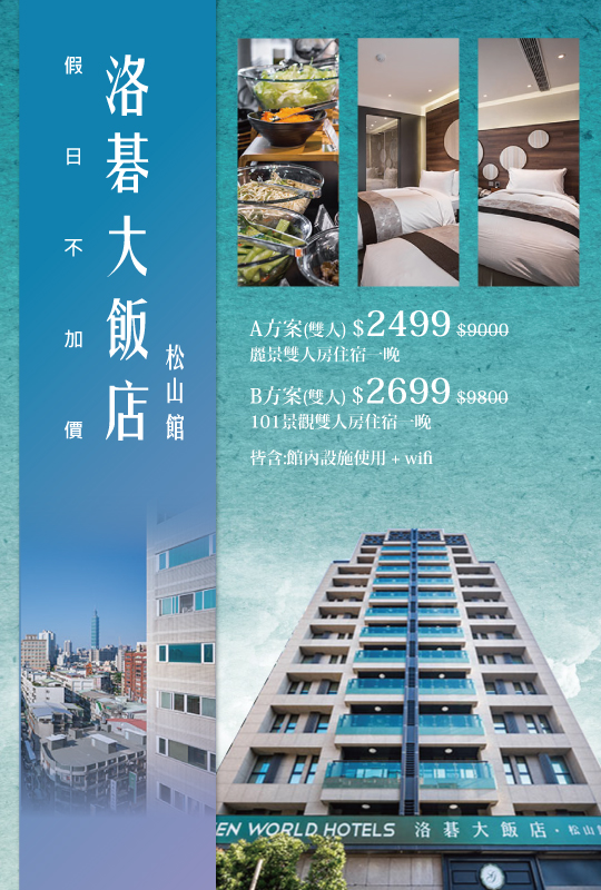 只要2499元起,即可享有【台北-洛碁大飯店松山館】假日不加價!雙人浪漫台北夜~住宿專案〈含A.麗景雙人房/B.101景觀雙人房 住宿一晚 + 館內設施使用 + wifi〉
